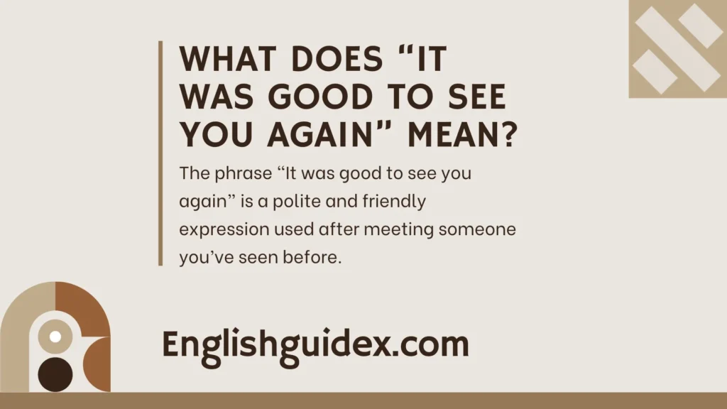 The phrase âIt was good to see you againâ is a polite and friendly expression used after meeting someone youâve seen before. It shows that you enjoyed the meeting and appreciated reconnecting.