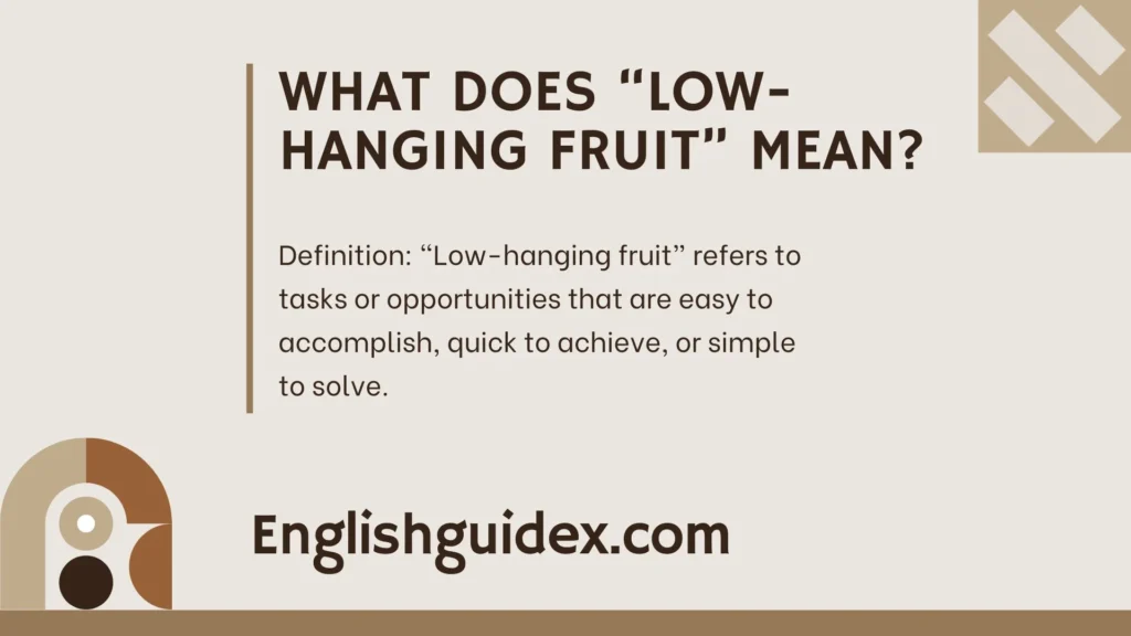 Definition: “Low-hanging fruit” refers to tasks or opportunities that are easy to accomplish, quick to achieve, or simple to solve.