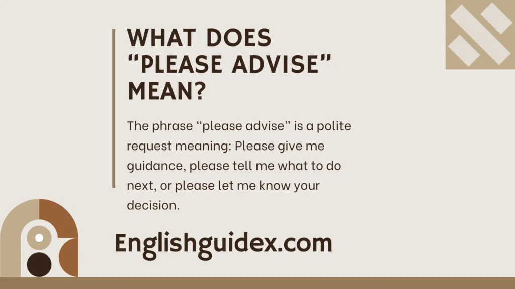 The phrase “please advise” is a polite request meaning: Please give me guidance, please tell me what to do next, or please let me know your decision. Grammarly+2upskillstutor.com+2