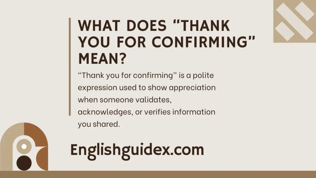 “Thank you for confirming” is a polite expression used to show appreciation when someone validates, acknowledges, or verifies information you shared.