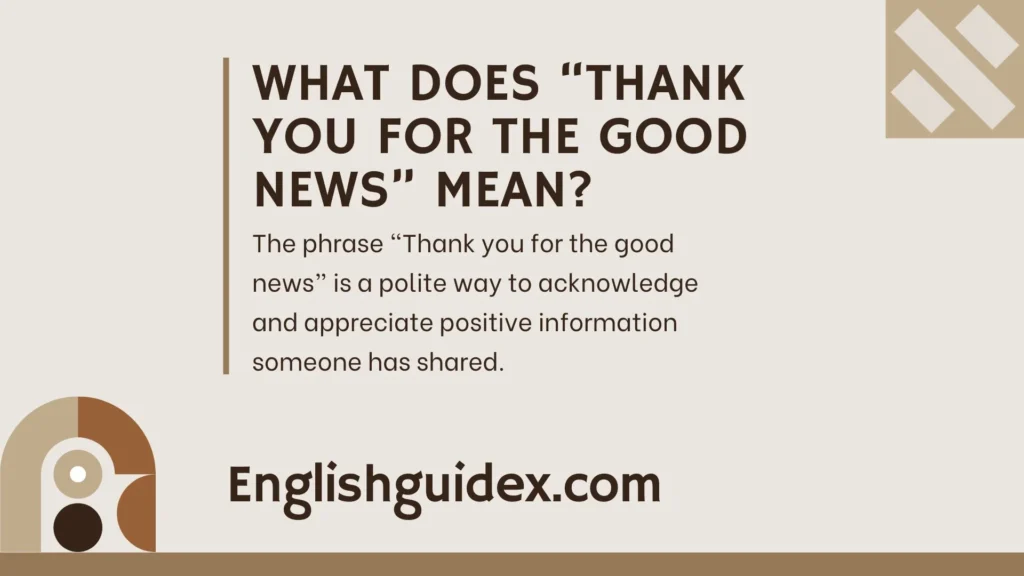 The phrase “Thank you for the good news” is a polite way to acknowledge and appreciate positive information someone has shared.