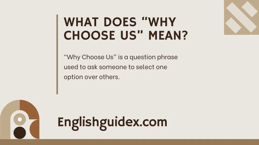 “Why Choose Us” is a question phrase used to ask someone to select one option over others. In business and professional English, it usually means:
